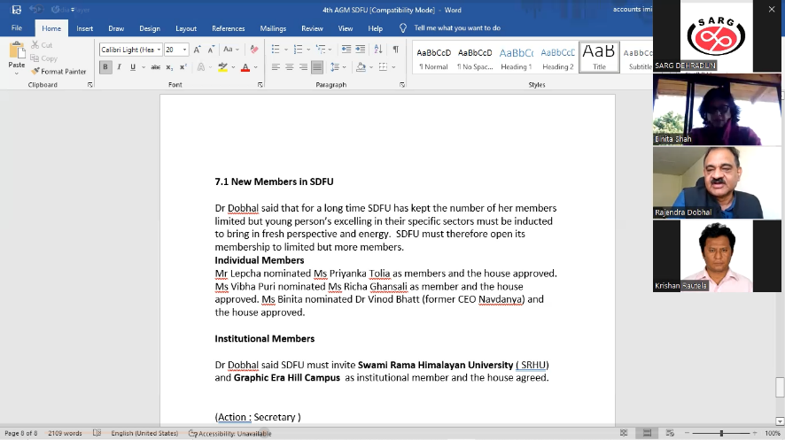 Inception Meeting of Sustainable Development Forum Uttaranchal was held in the registered office of SDFU at Dalanwala on 06 th April 2016. Most of the nominated councilors of the SDFU attended the meeting which was chaired by Late Dr. R S Tolia. The councilor who attended were Smt Vibha Puri Das, Shri BK Joshi, Shri STS Lepcha, Shri Rajendra Dobhal, Shri Krishan Rautela & Smt Binita Shah.